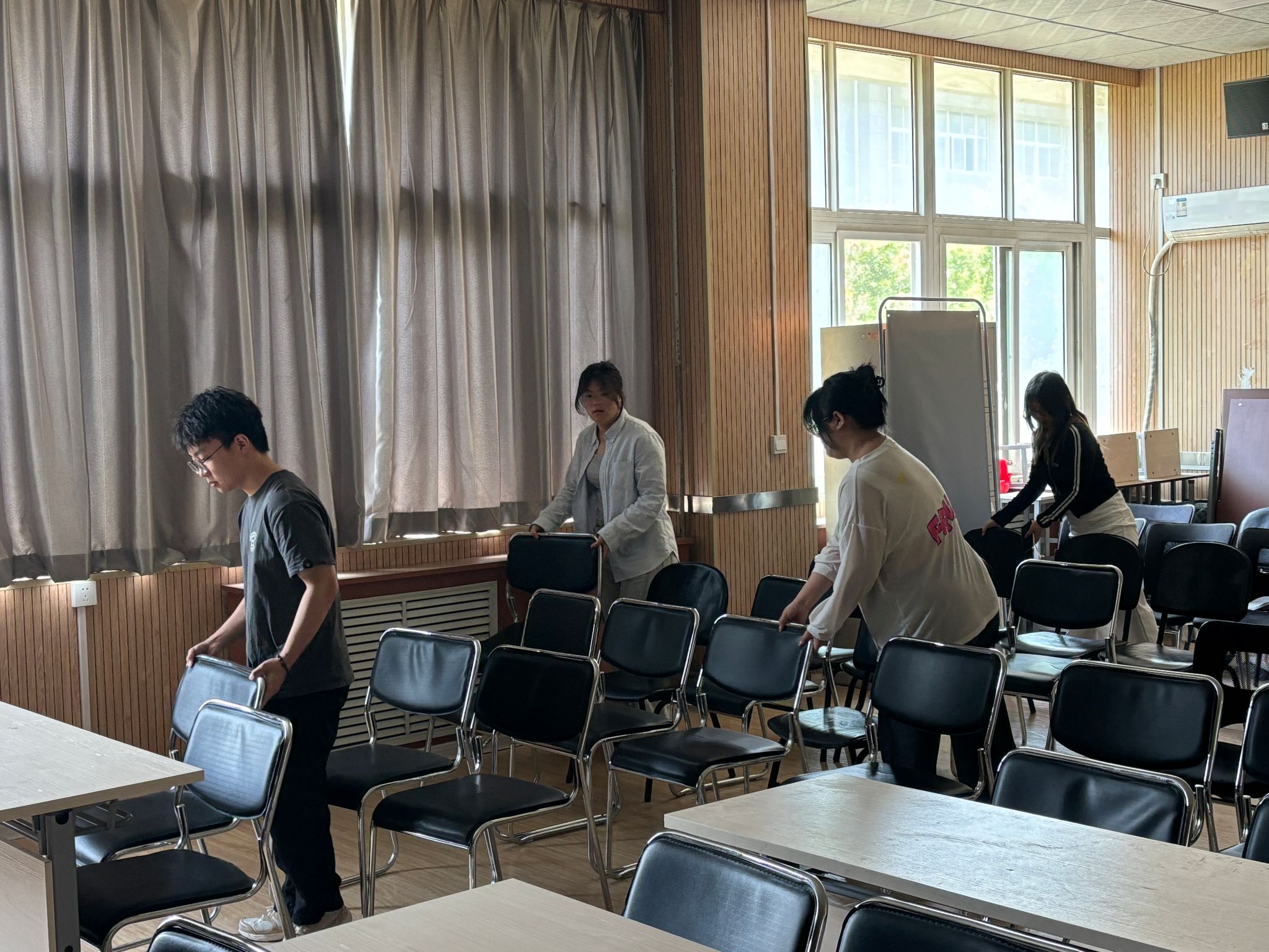 打扫过程中,大家分工明确、配合默契。有的同学擦拭会议桌椅、窗台和门框,清理桌面灰尘与杂物;有的同学清扫地面碎屑、垃圾,仔细拖洗地面,重点清理墙角、桌椅缝隙等容易积灰的卫生死角。大家态度认真、踏实肯干,不放过任何一处脏乱细节,用心整理清扫会议室整体环境。