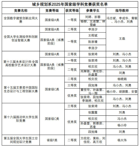 城乡规划系学子在2025年全国数字建筑创新应用大赛中获得全国一等奖两项;在2025年全国大学生测绘学科创新创业智能大赛中获得全国二等奖一项;在第十三届未来设计师·全国高校数字艺术设计大赛中获得全国三等奖一项,省赛一等奖一项,二等奖两项,冯小杰、刘勇被评为全国优秀指导教师和陕西赛区优秀指导教师;在艾景奖·第十五届中国国际生态设计与工程创新大赛中获得全国银奖一项、铜奖一项、优秀奖两项,刘勇被评为最佳指导教师;在第十六届园冶杯大学生国际竞赛中获得全国三等奖一项,优秀奖四项,欧洲杯直播